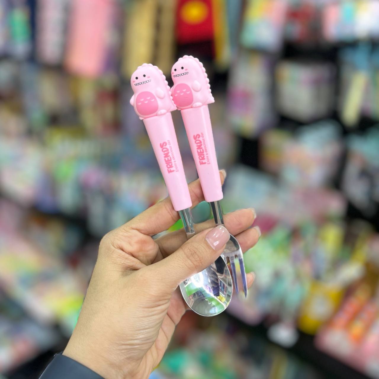 قاشق و چنگال دسته پلاستیکی دایناسور صورتی